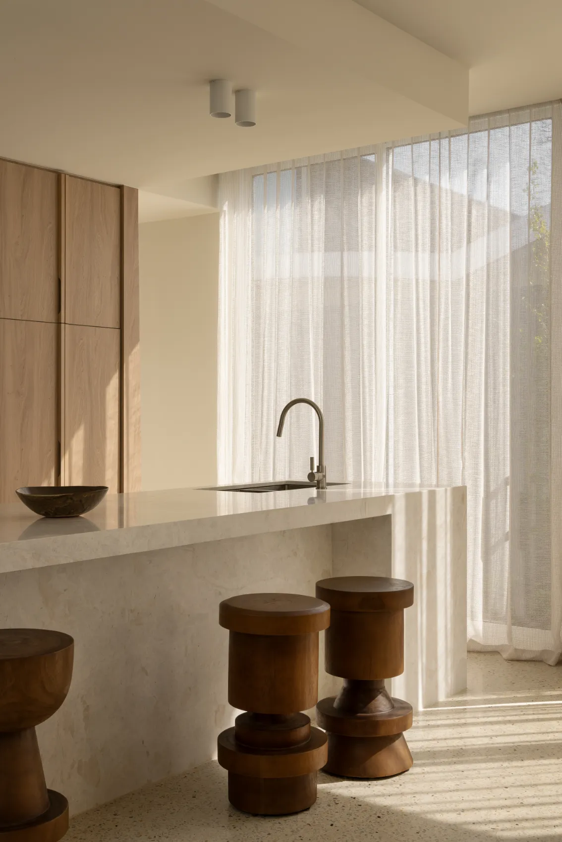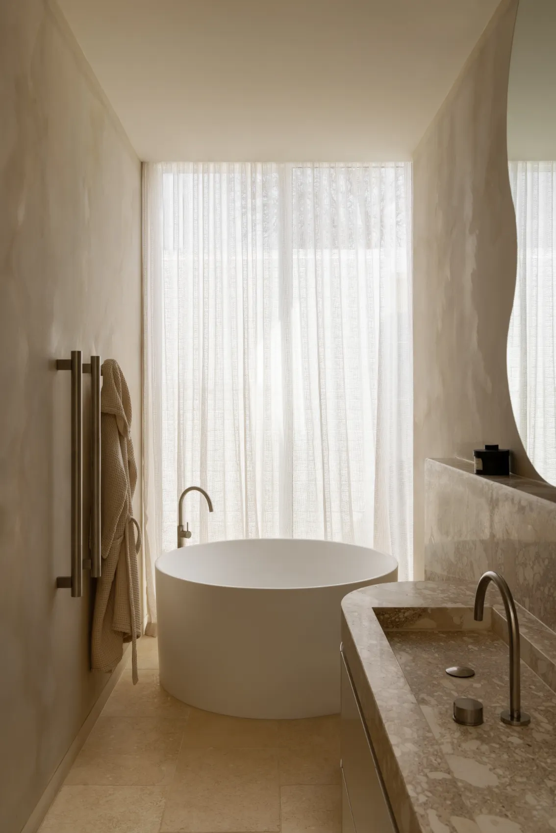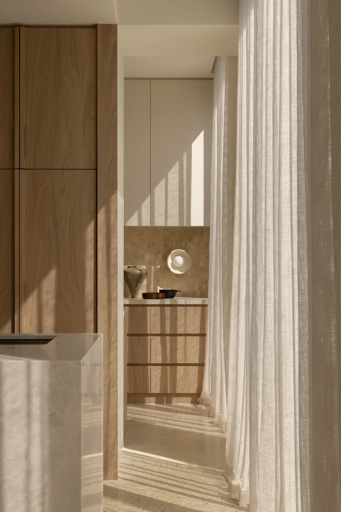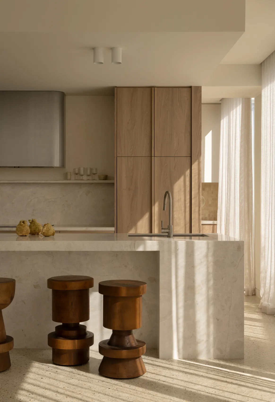 Designed as a peaceful retreat near the water, the space is a celebration of texture, form, and warm, natural materials.
