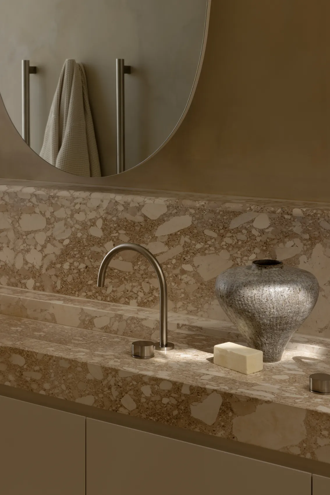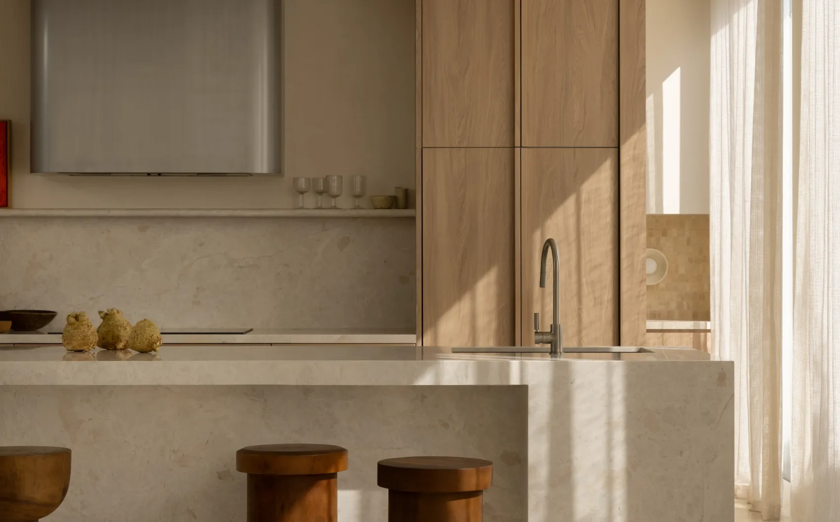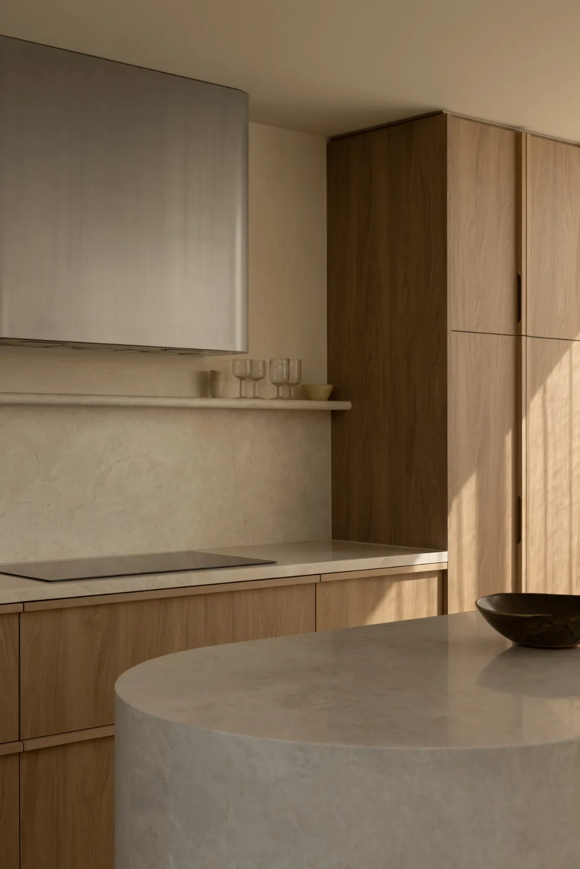Designed as a peaceful retreat near the water, the space is a celebration of texture, form, and warm, natural materials.