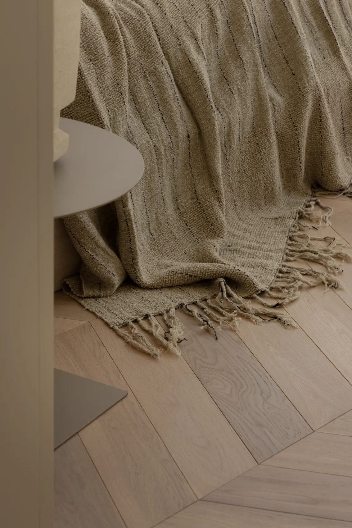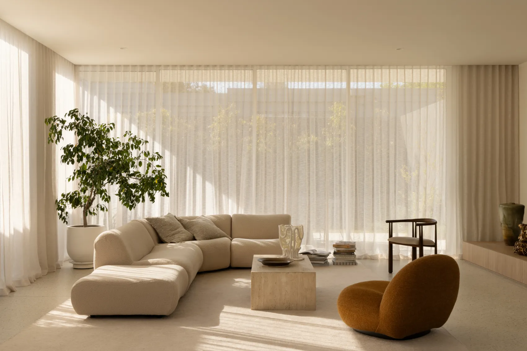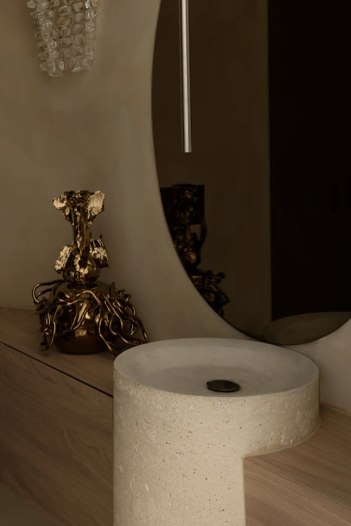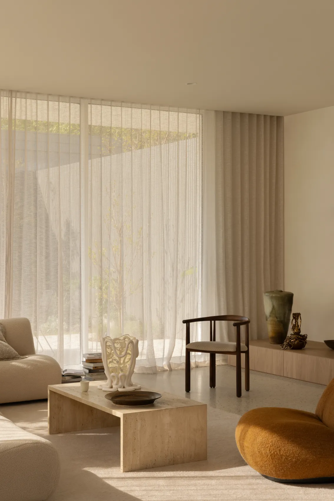 Designed as a peaceful retreat near the water, the space is a celebration of texture, form, and warm, natural materials.